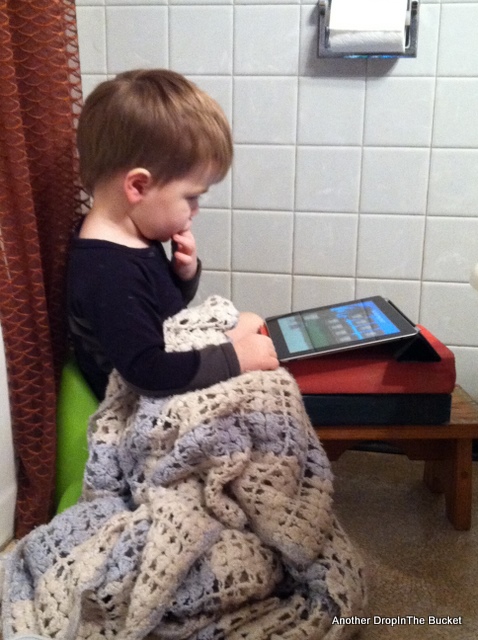 4. Liam and the potty: We spent Thursday morning trying to get a urine sample from Liam to test for a possible UTI. The first hour-and-a-half was in the bathroom with this set-up: